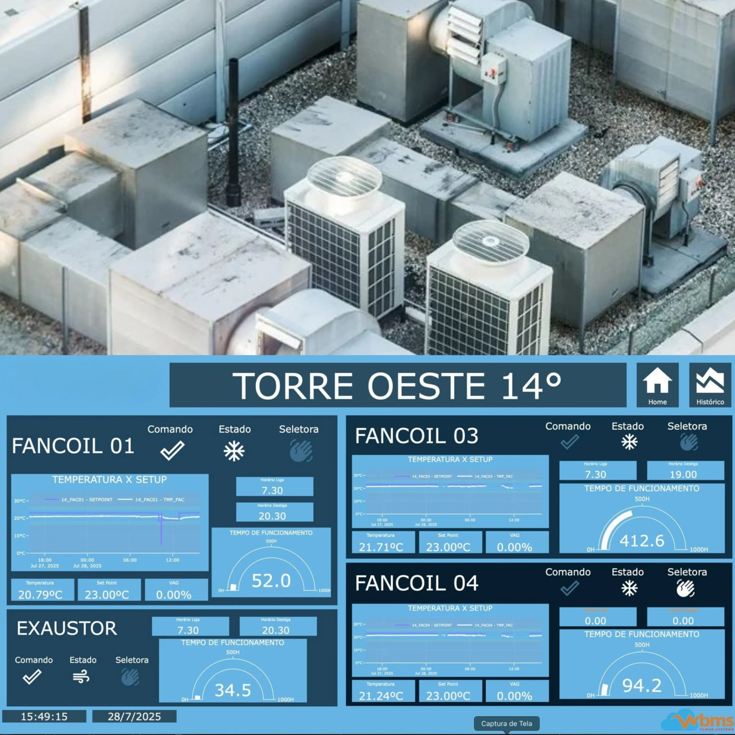 Por meio de dashboards customizados e atualizados em tempo real, acessíveis via supervisório em nuvem, que permitem o monitoramento remoto de todos os pontos críticos